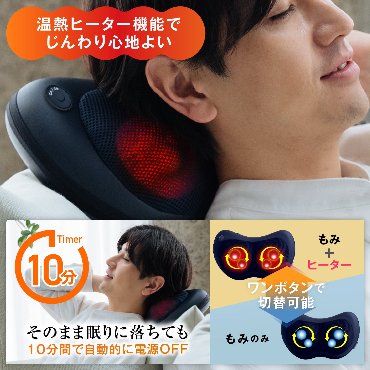 首・肩・腰・腕・足など、さまざまな部位に使用できる万能マッサージャーです(※頭部への使用はお控えください)。スイッチひとつの簡単操作でどなたでも扱いやすく、オート逆回転モードにより自然なもみ心地を再現します。さらに温熱機能を搭載しており、心地よい温かさで筋肉をやさしくほぐしながらリラックス。国内メーカーによる1年サポート付きで、安心してご利用いただけます。